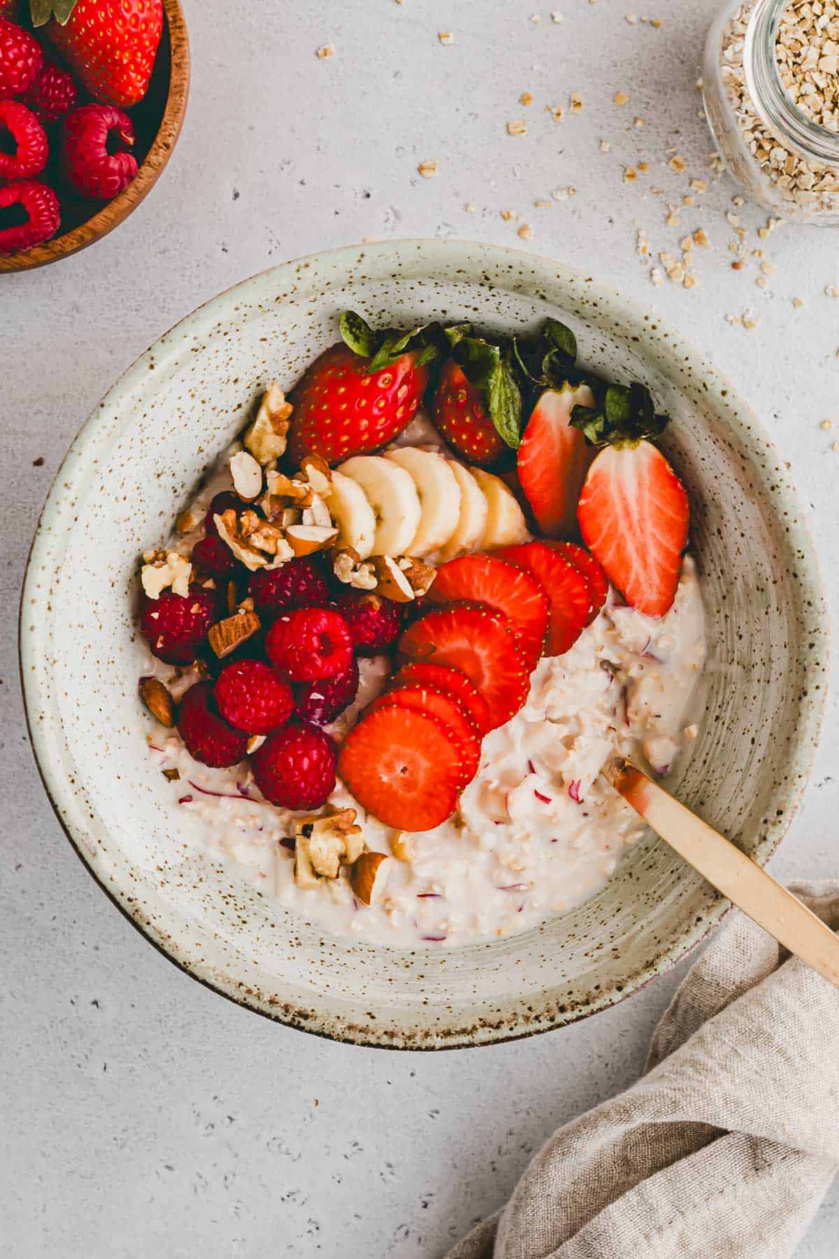 Das Originalrezept verlangt eigentlich, dass die Haferflocken für einige Stunden eingeweicht werden (ähnlich wie Overnight Oats). Dies macht sie sehr weich und besser verdaulich. Schmecken tut es frisch (ohne Einweichen) aber auch sehr lecker!