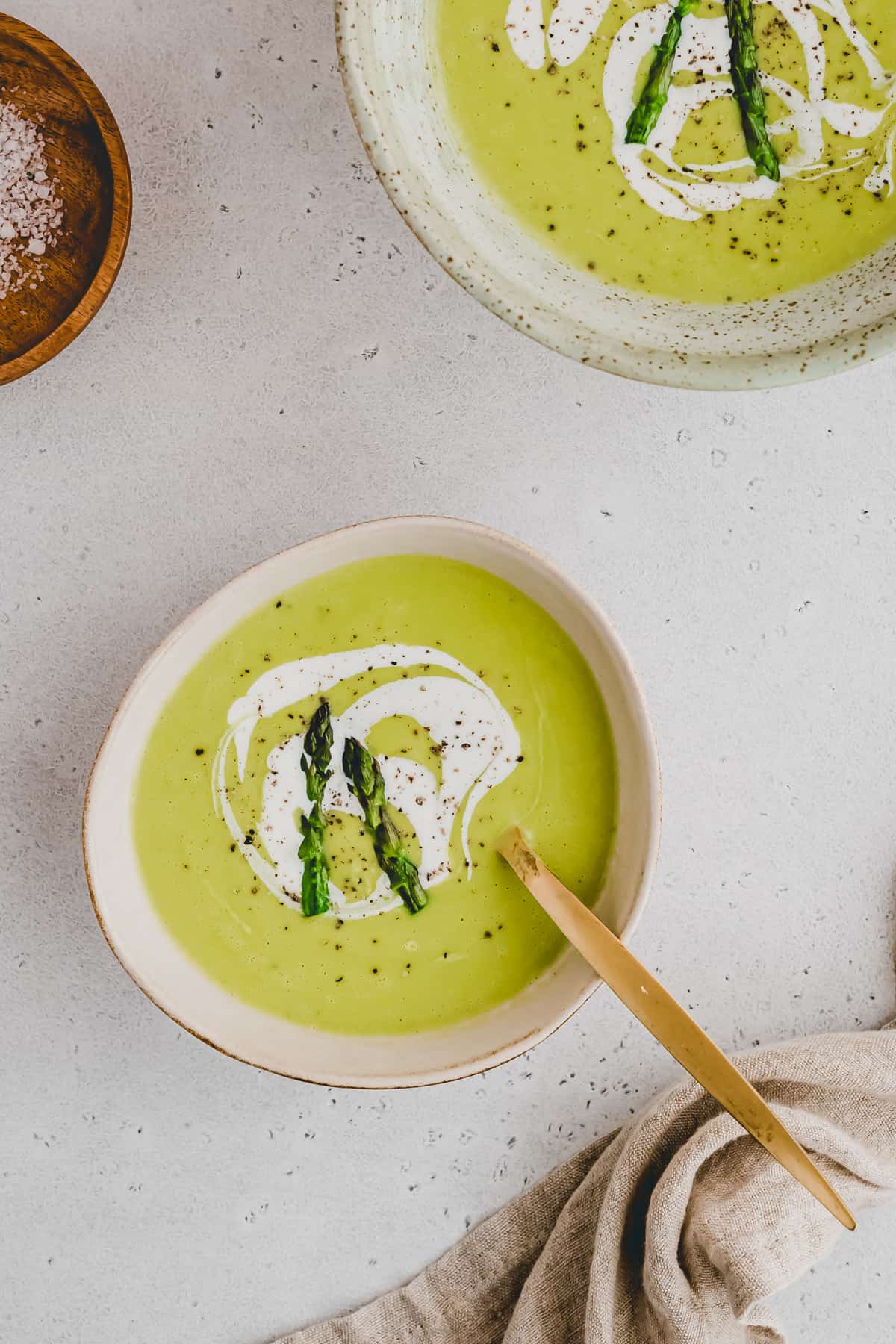Cremige grüne Spargelsuppe - schnell, gesund & lecker. Perfekt für die Spargelsaison! In 20 Minuten fertig & ideal als leichte Frühlingssuppe oder Vorspeise.