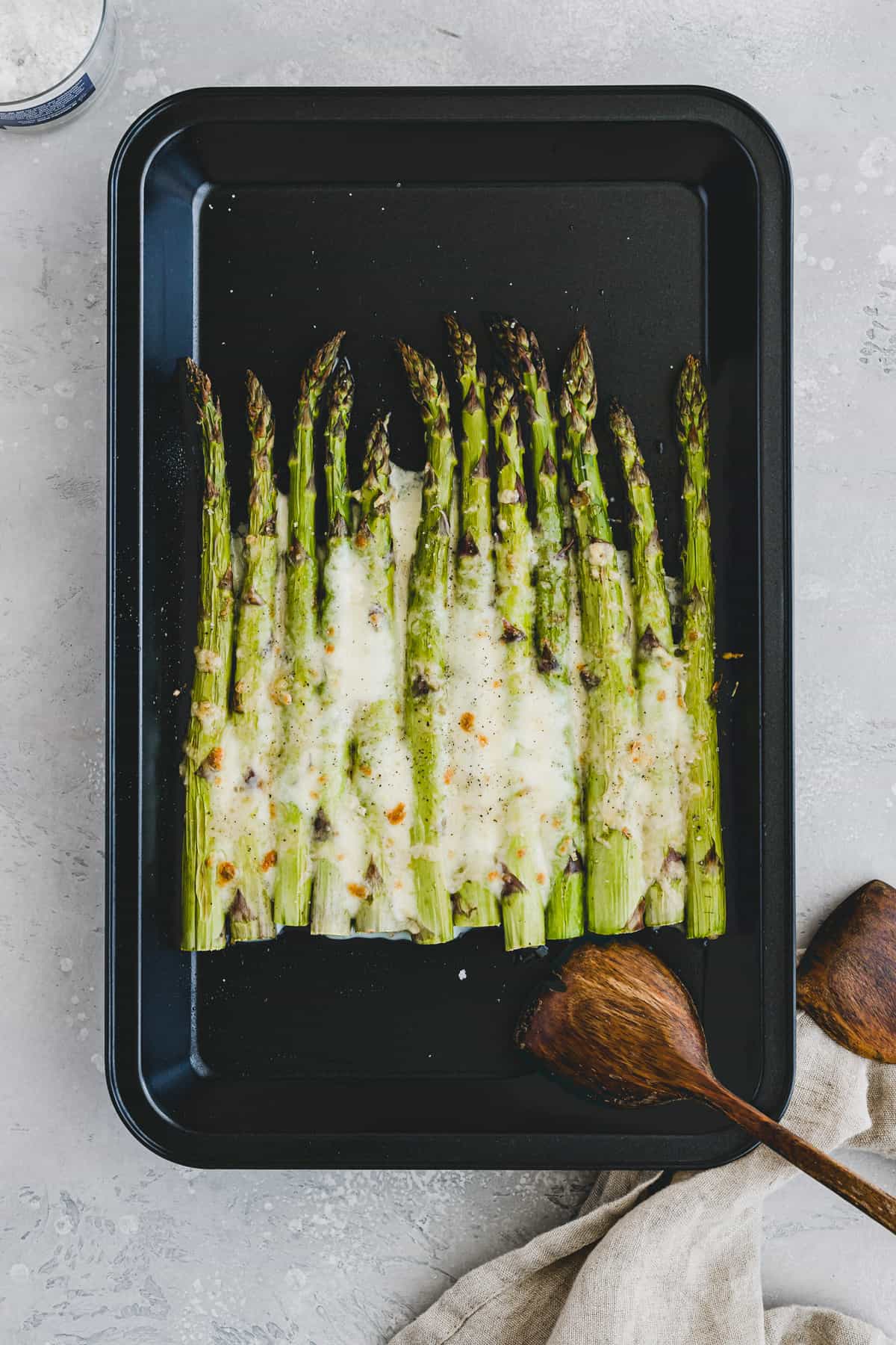 Grüner Spargel im Ofen mit Käse überbacken ist eine schnelle, unkomplizierte und herrlich käsige Gemüsebeilage - perfekt für die Spargelsaison.