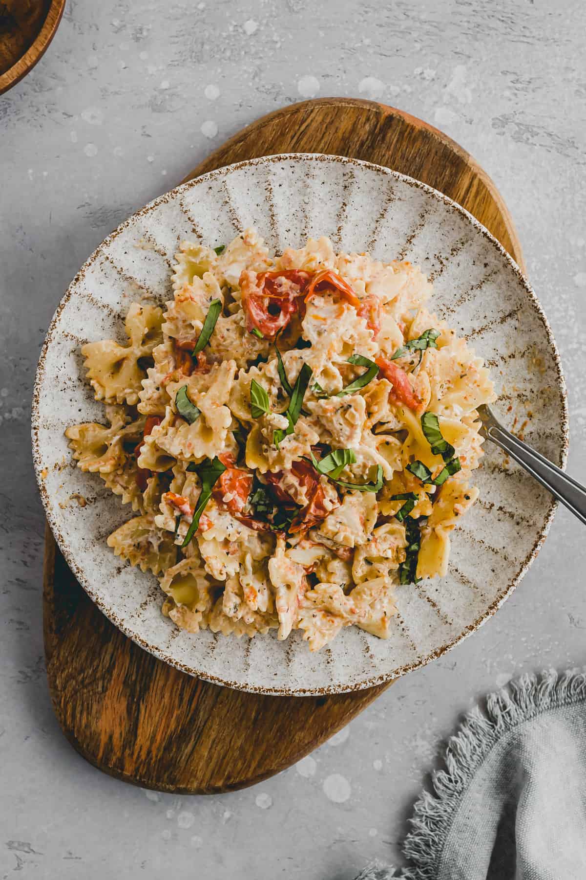 Kennst du Baked Feta Pasta? Der virale TikTok Trend mit Feta, Tomaten, und Pasta! Dieses Rezept ist super ähnlich, wird aber anstelle von Feta mit Frischkäse zubereitet und kann auch super easy in ein veganes Rezept abgewandelt werden.