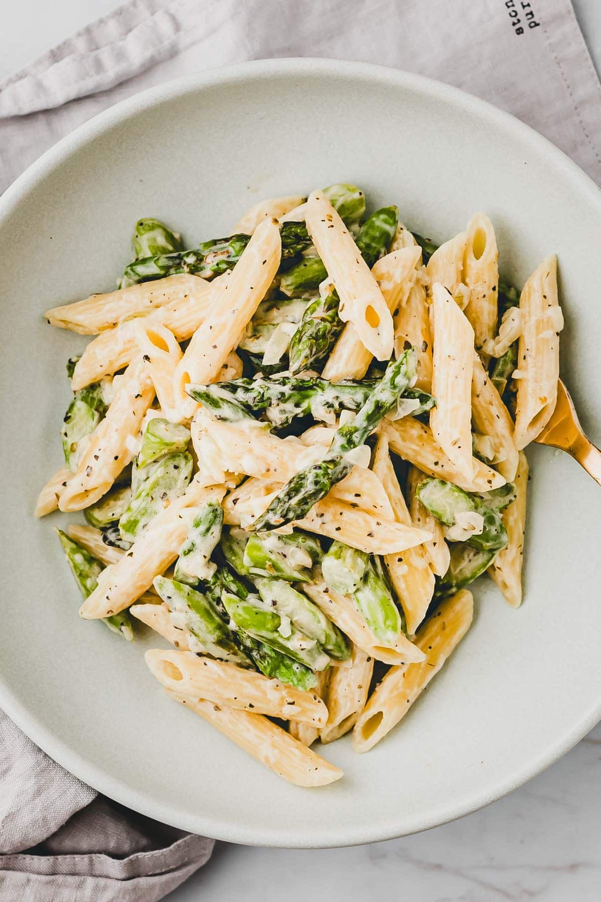 Pasta mit grünem Spargel Alfredo Style ist das perfekte Frühlingsgericht: Cremige Alfredo Sauce umhüllt knackigen grünen Spargel und Pasta. In weniger als 30 Minuten steht dieses aromatische, sättigende Nudelgericht auf dem Tisch.