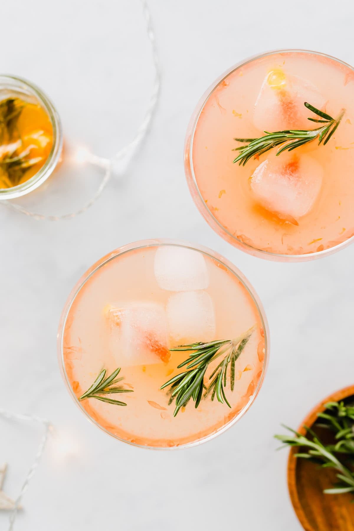 - Top it with sparkling water and ice cubes. Decorate with fresh rosemary or grapefruit slices.