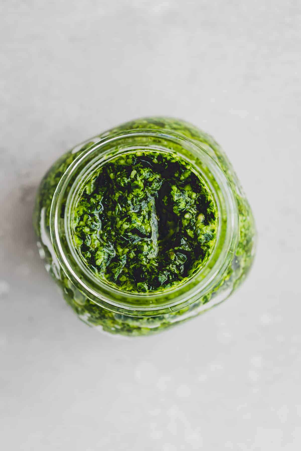 - Transfer the pesto into a clean jar and cover with more olive oil to keep it longer.